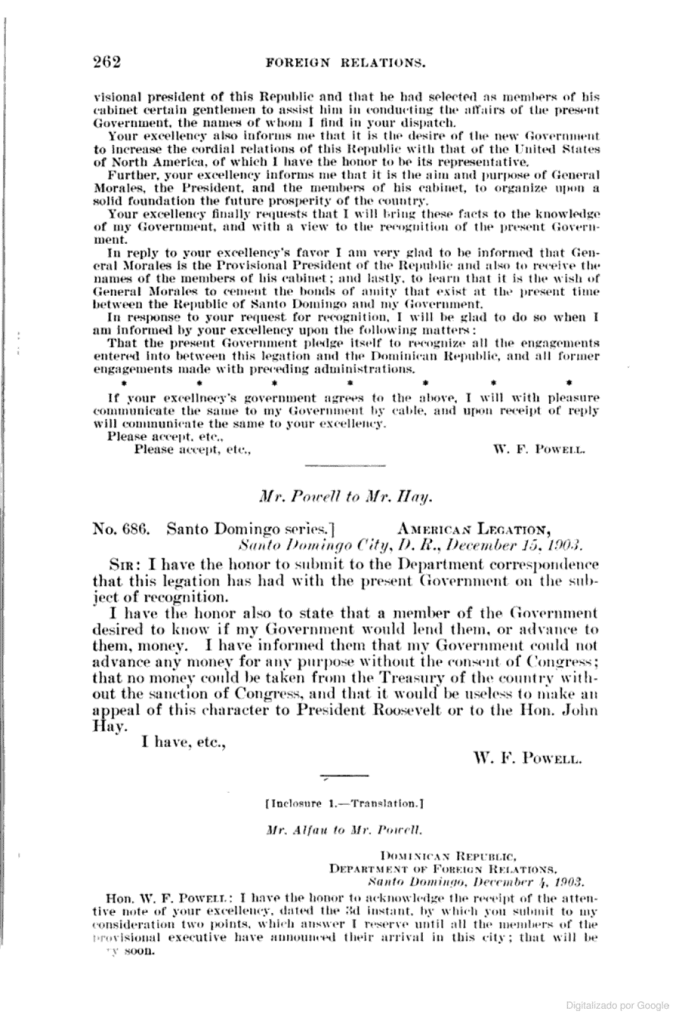 Nota: Como se aprecia en el texto anterior, William F. Powell, Encargado de Negocios de los Estados Unidos en la República Dominicana, le informa al Canciller dominicano que el Gobierno Provisional sería reconocido a condición de que éste, cita: “se comprometa a reconocer todos los acuerdos establecidos entre esta Legación y la República Dominicana, así como todos los compromisos asumidos por administraciones anteriores”. Se refiere al Protocolo del 31 de enero de 1903, suscrito con el Gobierno Provisional de Horacio Vásquez, en el que se acordó (Art. 1), cita: “el Gobierno Dominicano le pagará al Gobierno de los Estados Unidos la suma de cuatro millones quinientos mil dólares (US$4,500,000) oro americano, en los términos que fijarán los árbitros”. Suma que se le adeudaba a la compañía norteamericana San Domingo Improvement Co., el Protocolo también establecía la creación de un Tribunal Arbitral (que para la fecha de esta comunicación ya se encontraba deliberando en Washington) compuesto por tres árbitros que determinarían las condiciones de pago y las garantías, que eran las aduanas dominicanas. La Sentencia del Tribunal Arbitral fue dictada siete meses después, lo que se conoció como el Laudo Arbitral de Julio de 1904. La misma exigencia le había sido hecha, en agosto de ese mismo año, al Presidente Alejandro Woss y Gil quien, en principio, se negó alegando que ese Acuerdo no tenía ningún valor, puesto que había sido suscrito por un gobierno de facto y no había sido sancionado por el Congreso. Luego de que Powell le manifestara que de no reconocerlo romperían relaciones y se tomarían otras medidas, el presidente Woss y Gil aceptó los términos del Protocolo y procedió a nombrar dos de los tres jueces del Tribunal Arbitral, en razón de que cada gobierno debería elegir un juez y el tercero debería ser escogido de mutuo acuerdo entre los dos gobiernos, a más tardar dos meses después de la firma del Protocolo, de lo contrario debería ser escogido por el Presidente dominicano de entre los jueces de las Cortes de Apelaciones de Circuito de los Estados Unidos, como en efecto ocurrió. (C.D.M.M.)